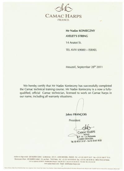 Harp expert - Regulation, Repair, Reriveting, Restoration and more. After caring for harps in the local Israeli harp community, in 2010 Nadav was invited to Camac Harps to do a course to become a certified technician. In 2011 Nadav visited the Salvi factory in order to learn more about Salvi and L&H harps. In 2012 he visited the Eagle Harp factory in Nanjing China and learned more about their instruments.